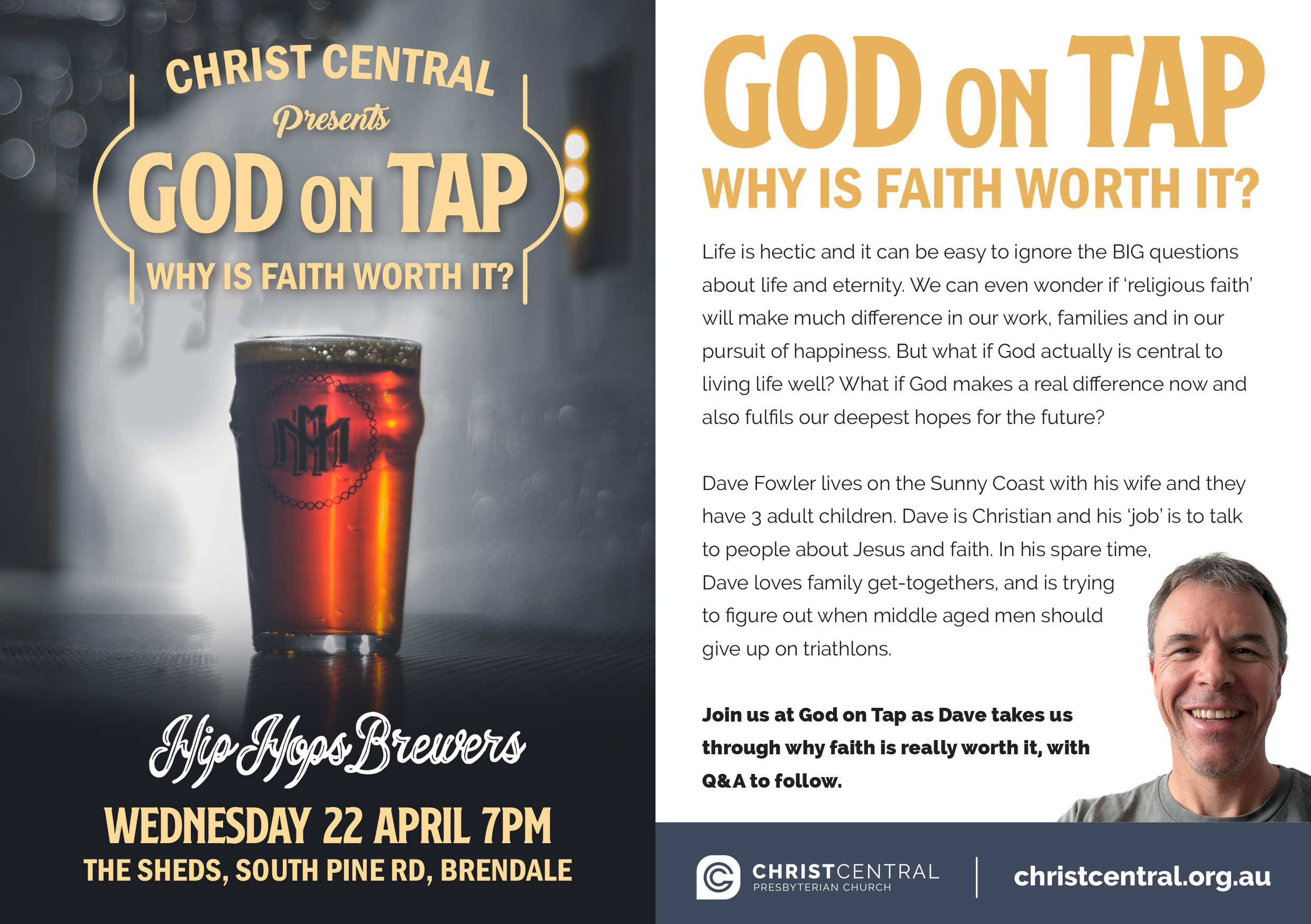 Dave Fowler lives on the Sunny Coast with his wife and they have 3 adult children. Dave is Christian and his ‘job’ is to talk to people about Jesus and faith. In his spare time, Dave loves family get-togethers, and is trying to figure out when middle aged men should give up on triathlons.